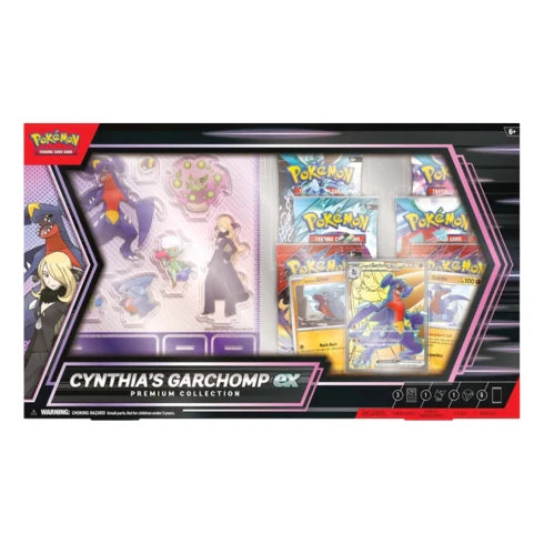 - The Pokémon TCG: Cynthia’s Garchomp ex Premium Collection includes: 1 full-art foil promo card featuring Cynthia’s Garchomp ex, 2 foil cards featuring Cynthia’s Gible and Cynthia’s Gabite, 1 sheet of acrylic standees featuring Cynthia, Garchomp, and more, 1 double-sided backdrop display, 1 photo sticker featuring Cynthia and Garchomp, 6 Pokémon TCG booster packs and code card for Pokémon TCG Live